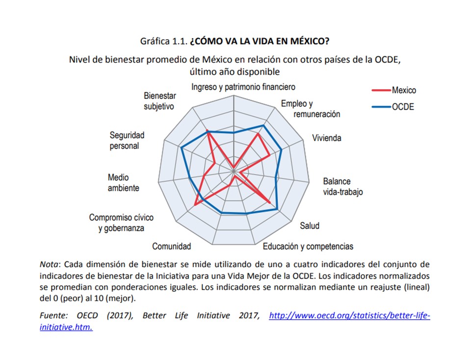 Con esos antecedentes, hay que revisar el nuevo documento de la OCDE. Para responder a la pregunta ¿Cómo va la vida en México?, se ocupan once dimensiones de bienestar en una gráfica radial, donde se aprecia el promedio de los países pertenecientes al organismo, y se comparan con los resultados mexicanos. En los aspectos: Bienestar subjetivo y Compromiso cívico y gobernanza, México está en el promedio de los países del organismo. Para el caso de Empleo y remuneración, Vivienda y Salud, los indicadores de nuestro país, están por debajo del promedio internacional. Pero hay otras dimensiones que arrojan resultados muy por debajo del promedio del organismo: Ingreso y patrimonio financiero, Balance vida-trabajo, Educación y competencias, Comunidad, y Seguridad personal. En esa valoración internacional de cero a 10, la educación mexicana tiene 0.5 de calificación.